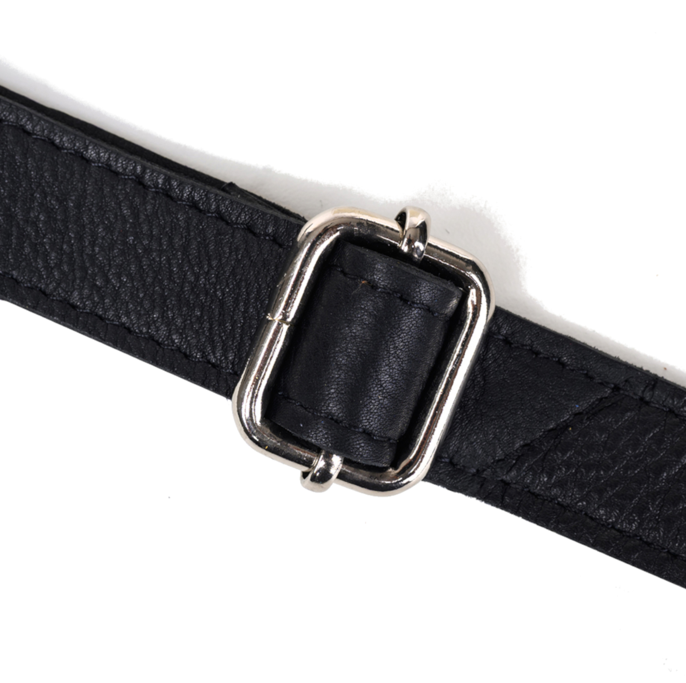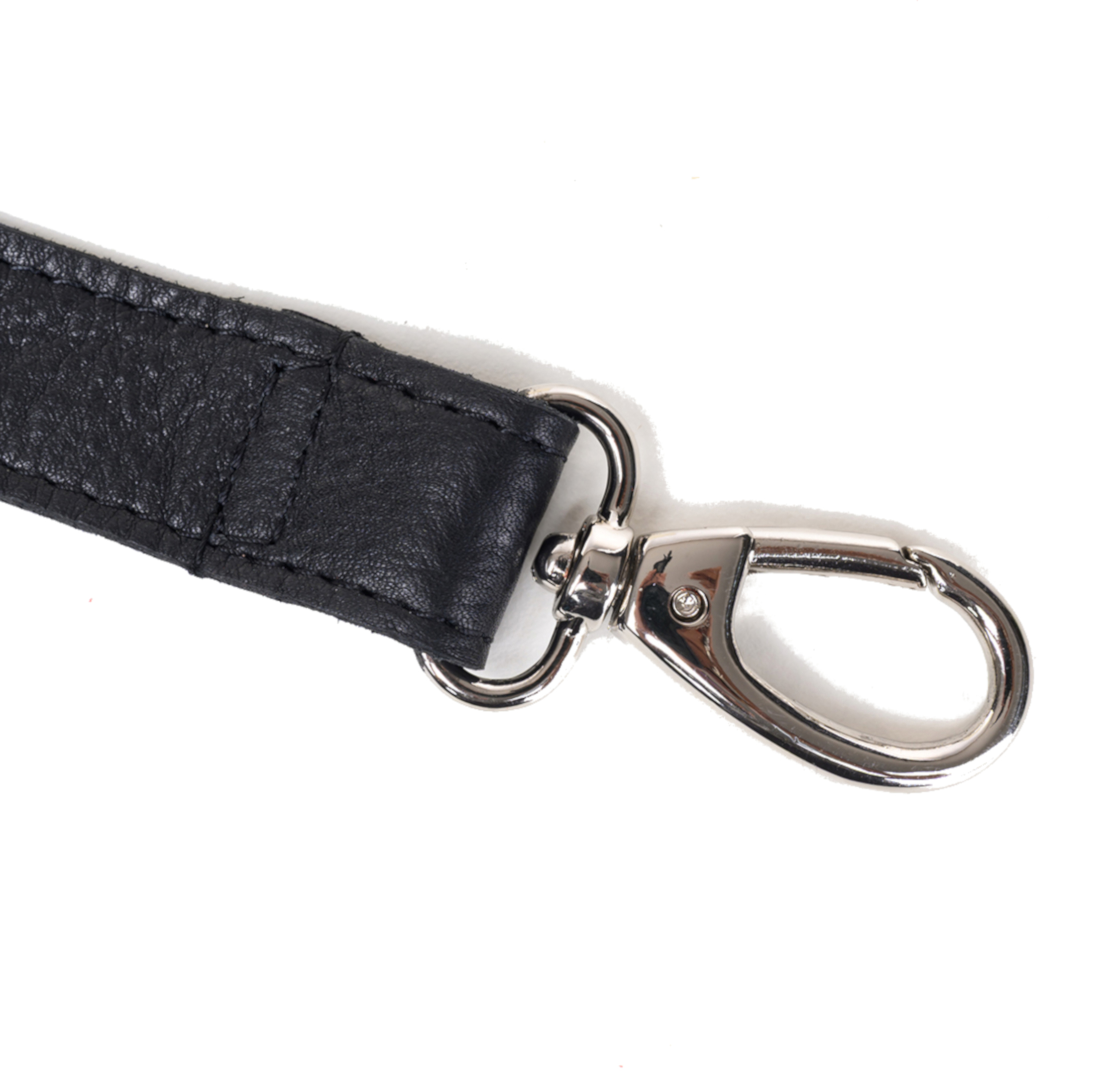 - Adjustable strap: 55 - 110 cm. This allows the bag to be worn over the shoulder, across the chest or around the hips. Closure: zip (metal). Strap material: leather.